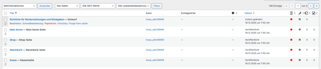 Die Seiten Mein Konto, Shop, Warenkorb, Richtlinien und Kasse werden vom WooCommerce automatisch erstellt, da diese notwendig sind. Zudem erhälst du links in der Navigation folgende neuen Punkte: